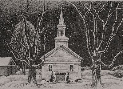 A later lithograph dated 1949 also carries the title, Colonial Church. It appears that Fiene used the same church in Stepney, Connecticut as the subject for three lithographs: Colonial Church [1], c. 1948 (above); New Snow, 1946; and Colonial Church [2], 1949. Because two prints in the catalogue bear the title "Colonial Church," we have designated them "Colonial Church [1]" and "Colonial Church [2]," where the numbers in square brackets have been assigned, for purposes of clarification, by us not the artist. **Date: This lithograph was published by Associated American Artists as one of a series of miniature prints by various artists. The AAA catalogue for this series of miniatures appeared in 1948, and is, thus far, the only basis for dating the work. The other print by Fiene from this series is Sunset. ***Edition: Unlike most AAA editions, which were 250 impressions, AAA published their miniatures in editions of 200.