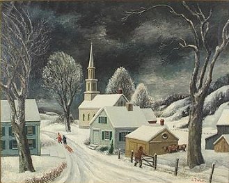*Alternate title and date on an impression outside the edition: One impression (at least), outside the edition of 100, bears the title "Connecticut Village," just below the image in pencil, l.l., and is dated "34" just below the image in pencil, l.r. Whether there was only one printing, produced in 1934 most of which were signed and dated later in 1935, or there was a first printing of an unknown number in 1934 and a second printing of 100 produced in 1935 is unknown. A likely speculation is that an edition of 100 plus proofs was printed in 1934 originally intended by Fiene to be titled "Connecticut Village." After annotating one or more impressions with this title, 100 impressions were consigned to Associated American Artists and sold with their COA as "Colonial Village" and dated 1935. The only observed impression bearing the title "Connecticut Village" and dated 1934 resides in the estate of the artist. Illustrated in: "One Hundred Prints by One Hundred Artists of the Art Students League of NY, 1875-1975." Related Works and Setting: The theme of a road leading into a village recurs often in Fiene's rural landscapes. No matter the season, the road, the church, some strategically placed trees, and a colonial house or two were often elements of the composition. Sometimes people or animals are introduced into the scene, sometimes not. The lithograph Entrance to Village, a Woodstock, NY, scene from 1927, is an earlier variation on this theme, though neither winter nor night are part of the picture. The paintings below, like the lithograph "Colonial Village," are set in Connecticut after 1933 when Fiene established a residence in Southbury.