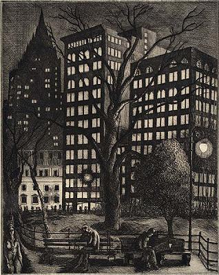 *Title and Edition: A second edition of this print entitled City Lights was offered by Associated American Artists (AAA) in 1940. As far as is known the artist did not alter the plate for this subsequent edition, with the exception that AAA may have, as suggested by the late Sylvan Cole, steel-faced it in order to achieve the larger edition (Interview with Sylvan Cole, longtime director of AAA, 2004). **Annotations: Typically the title appears in pencil in the margin, l.l., just below the platemark of the image. Several impressions, however, including BPL and WMAA, have the title in pencil in the lower margin at the bottom center of the sheet. (See just below.)