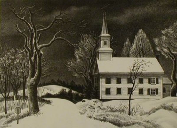 More specifically, the church is in Stepney, Connecticut. Related Works: In 1949, Fiene revisited the subject in a lithograph and produced a very similar, though reversed, image. (See Colonial Church (1949). Fiene used the same church in Stepney, Connecticut, as the subject for three lithographs: New Snow, 1946 (above); Colonial Church, 1948; and Colonial Church, 1949. The painting shown below bears the same title and is essentially the same image. Currently in a private collection, it was formerly in the collection of the Metropolitan Museum of Art. About the painting, Fiene wrote: "Note how the sky creates the general mood of the landscape. I felt that the agitated, dark sky and the old gnarled trees emphasized the feeling of the new, untrodden snow, and the classical simplicity of the early New England Church" (Fiene, Complete Guide 106). Fiene produced a series of works both in oil and lithography on Connecticut Churches in which his compositional concern was "to achieve the clean and classical expression of the style of the church." To achieve this effect "detail is kept to a minimum," he writes (107). On the other hand, the somber mood was "very definitely" a reflection of his own mood during this period (Buitar 93). |