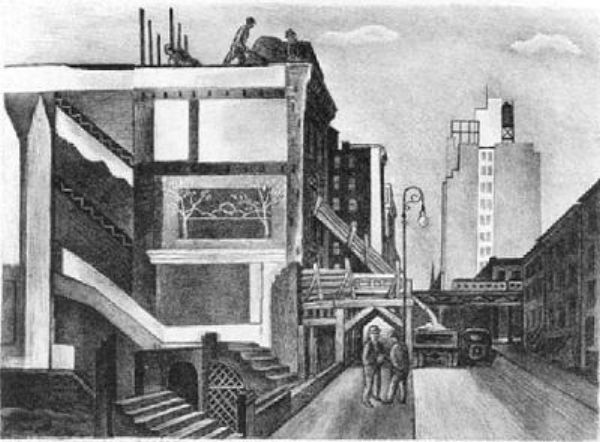 Fiene created a series of paintings during the early Thirties on the subject of old buildings in New York City being razed to make way for the new. For an example, see below.