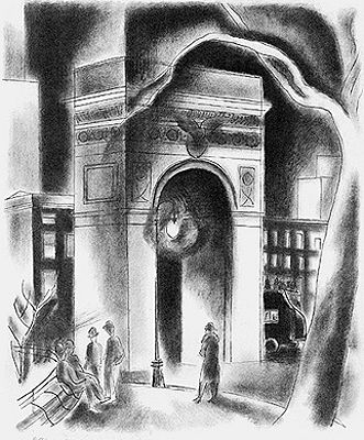 Setting: The "Washington Arch" is located on the north side of Washington Square Park at the southern terminus of 5th Avenue in Greenwich Village, New York City. The arch, commemorating the inauguration of George Washington, was designed by Stanford White and erected in 1895. Fiene executed two other prints, also in 1928, with a Washington Square setting: "Washington Square No. 1" and "Washington Square No. 2". In April, 1927 Fiene's New York City address was 19 E. 9th Street, just around the corner from the arch. Most likely he was still there in 1928, when the Washington Square lithographs were executed. |