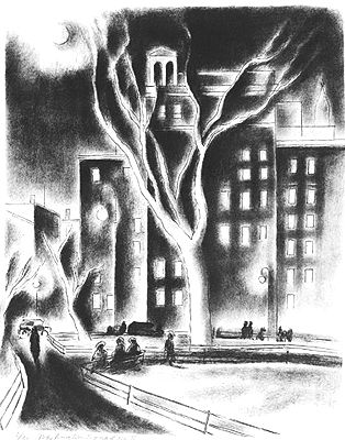 Setting: The "Washington Arch" is located on the north side of Washington Square Park at the southern terminus of 5th Avenue in Greenwich Village, New York City. The arch, commemorating the inauguration of George Washington, was designed by Stanford White and erected in 1895. Fiene executed two other prints, also in 1928, with a Washington Square setting: Washington Arch and Washington Square No. 1. In April, 1927, Fiene's New York City address was 19 E. 9th Street, just around the corner from the arch. Most likely he was still there in 1928 when the Washington Square lithographs were executed. |