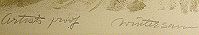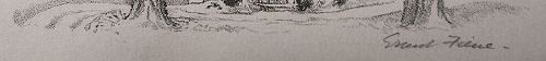 Thirty-six years later in 1965, when Fiene traveled to Paris to make color lithographs, Atelier Desjobert was again the print shop where he chose to work, although its founder had died two years earlier. By the middle Sixties, prints were again becoming commercially viable in the American market as well as in France, especially color work, and Fiene undoubtedly wanted to capitalize on the trend. Fiene and his long time artist friend Adolf Dehn found themselves working together in Desjobert's shop, and by August, Fiene had completed eight editions of color lithographs when his sudden death from a heart attack occurred. (See Adams, "Adolf Dehn ,"38-40). To view all Fiene prints known to have been printed by Desjobert, click here. 3. Fiene as his own printer: Several early etchings include "imp" after Fiene's signature indicating he printed them himself. This is not the case for etchings printed after the late twenties. No more information is currently available about Fiene as a printer of his own etchings. Signatures and Other Pencil Annotations When Ernest Fiene signed and annotated his prints, he signed in pencil. He never signed or annotated on the stone or in the plate, as far as we know. Over his years as a graphic artist, he developed several patterns of annotation. From most common to least common, they are as follows: